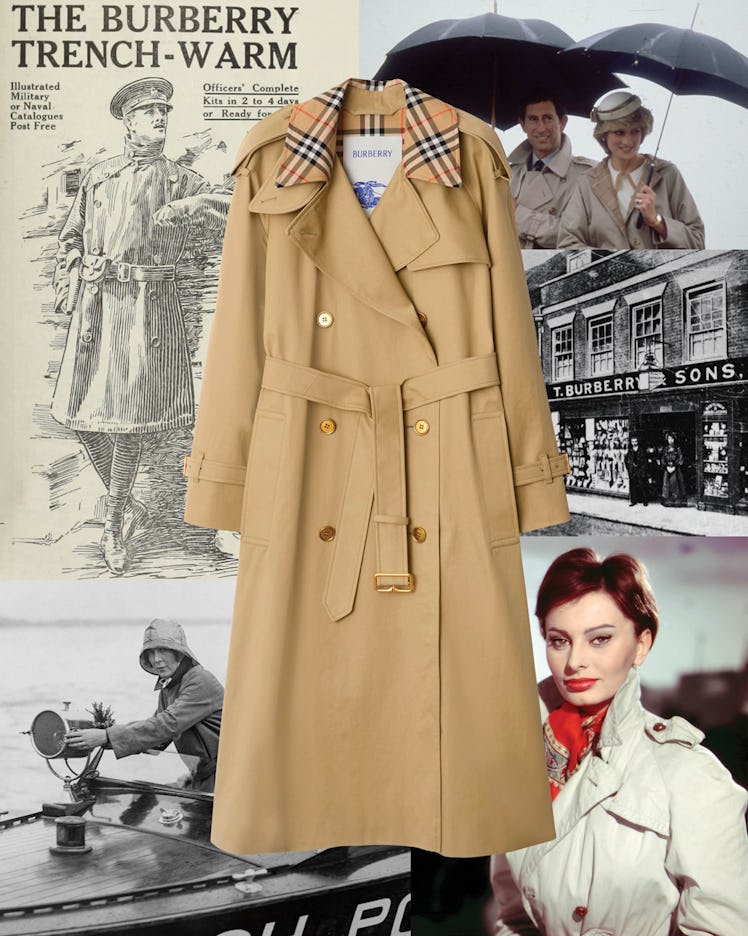 Lead image clockwise from top left: courtesy of Burberry (2); Central Press/Getty Images; courtesy of Burberry; Silver Screen Collection/Getty Images; Fox Photos/Hulton Archive/Getty Images.